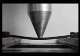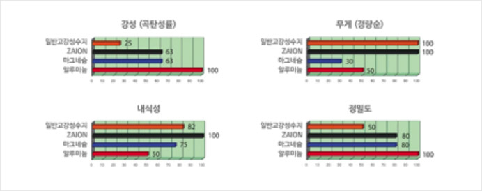 자이온 강성비교 각각 5kg의 부하를 걸었을 때 휘는 정도를 비교하였다. 「자이온」은 휨이 적고 강성이 높다.